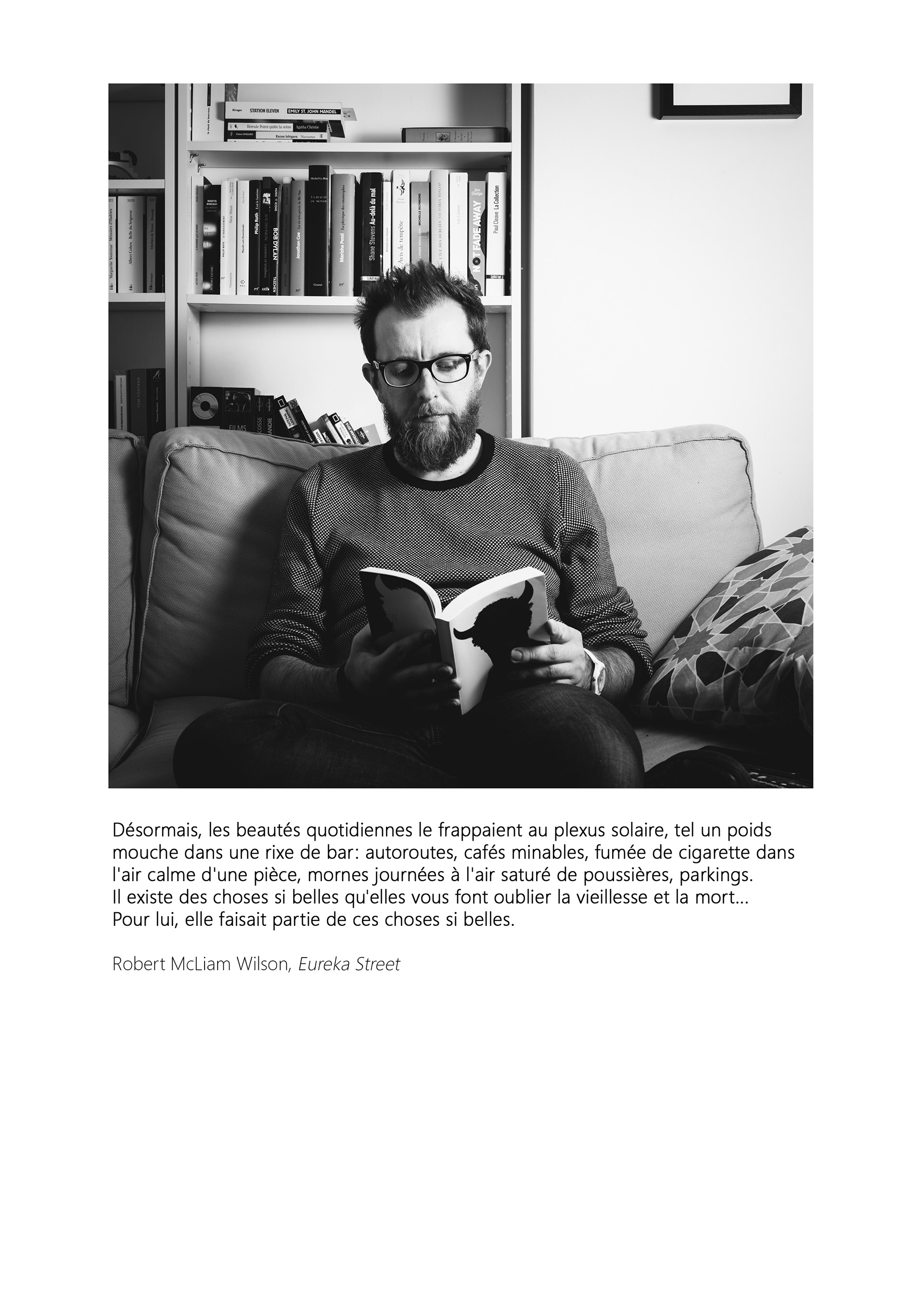 Il s'agit, dans le cadre de ce projet, de faire appel aux lecteurs. Ici, je cherche à les photographier dans ce que j'appelle leur "habitat naturel", en action de lecture.Je leur demande ensuite de me faire parvenir un extrait d'une oeuvre littéraire qui leur parle particulièrement, les touche, leur fait sens, leur importe, etc. Cet extrait est joint au portrait du lecteur.
